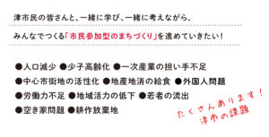 津市の身近な課題。空き家、耕作放棄地、農業・林業・漁業。少子高齢化が進む中の、担い手の問題。目の前にある課題から目をそらさない!